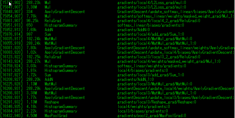 (1) 打印出的张量表的列依次是:执行时间,张量大小,操作类型,张量名。