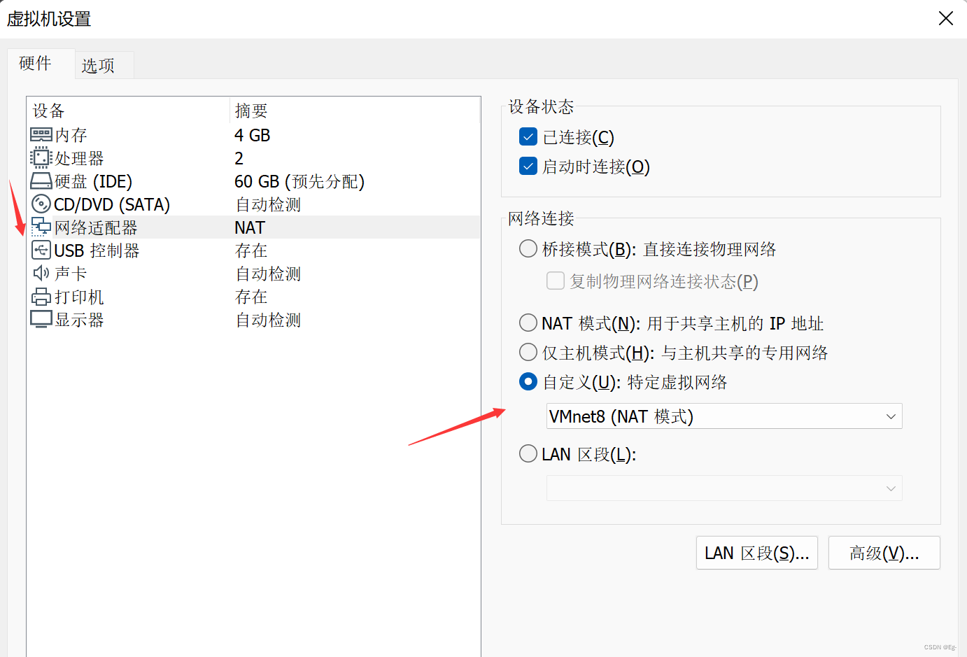 1、在虚拟机的设置里把网络连接模式设置为自定义:vmnet8