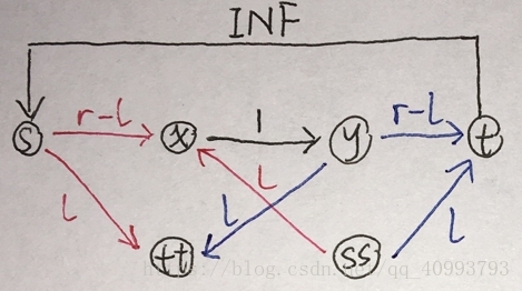 对于每条有上下界限制的<u,v>,题目中为<s,x>,<y,t>,做3条边(括号里为容量)<ss,v>(l),<u,tt>(l),<u,v>(r-l)。其中前2条边称为附加边,第3条边称为自由边。