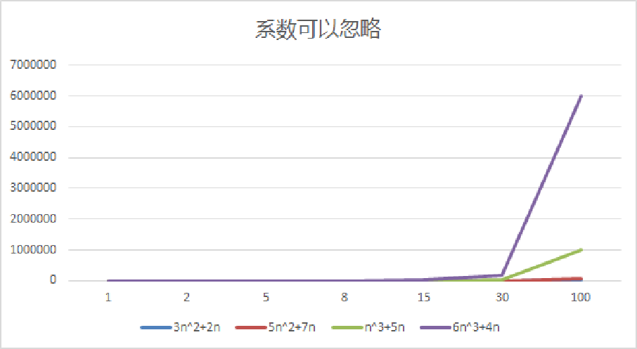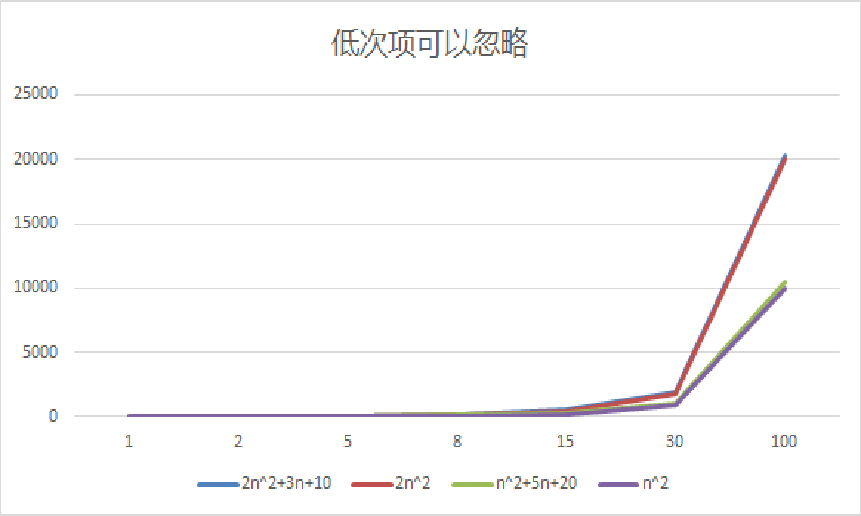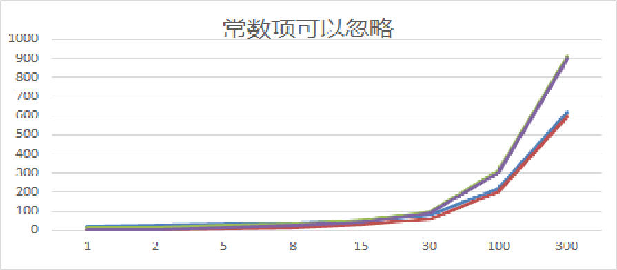 比如上面,我们计算1到100的第一种算法中,有两行int total=0;和 int end = 100;这两行代码,这个数值是2,我们一般计算时间复杂度的时候,会忽略这个常数项的。为什么呢?请看下面四个函数,随着n的增大而增大运行时间。