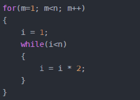 在while循环里面,没吃都是将i*2的。n的值是固定的,所以在i乘完之后,i距离n就越来越近了。假设循环x次之后,i就大于n了,此时这个循环就退出了。也就是说2的x次方等于n了。那么x=log2n。也就是说当循环了log2n次以后,代码就结束了。因此这个代码的时间复杂度就是