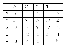 * denotes that a space-space match is not allowed. The score of the alignment above is (-3)+5+5+(-2)+(-3)+5+(-3)+5=9.
