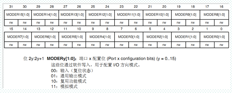 11.端口模式寄存器(GPIOx_MODER)如下: