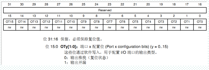 12.端口输出类型寄存器(GPIOx_OTYPER)如下: