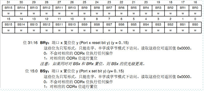 16.端口置位/复位寄存器(GPIOx_BSRR)如下: