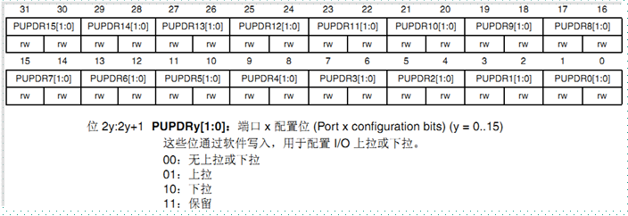 14.端口上拉下拉寄存器(GPIOx_PUPDR)如下: