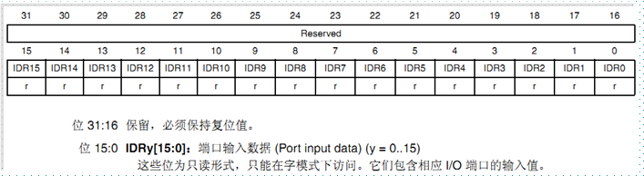 15.端口输入数据寄存器(GPIOx_IDR)如下: