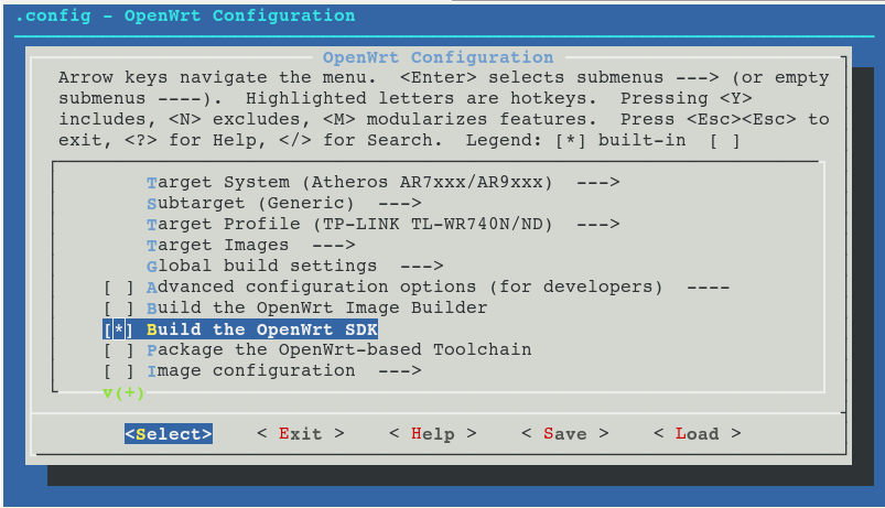 $ cp bin/ar71xx/OpenWrt-SDK-ar71xx-generic_gcc-4.8-linaro_uClibc-0.9.33.2.Linux-i686.tar.bz2 ~/Workspace/OpenWRT $ cd ~/Workspace/OpenWRT $ tar jxvf OpenWrt-SDK-ar71xx-generic_gcc-4.8-linaro_uClibc-0.9.33.2.Linux-i686.tar.bz2