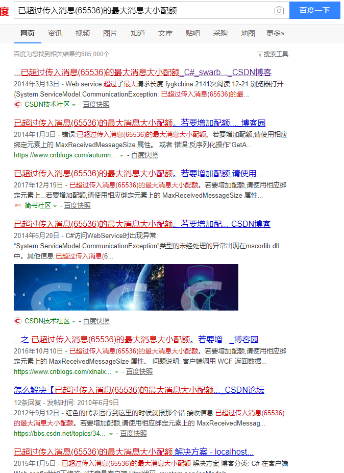 其实这样的问题以前也遇见过,但是当时第一个遇见这个问题的是另外一个同事,我是在其他的项目上,后来他们稀里糊涂的就解决了。就没去深究是怎么一回事。这次遇见了也没在意,想着应该问题不大,百度就能解决了。过了一会儿开始着手解决这个问题。第一步在百度输入”已超过传入消息(65536)的最大消息大小配额“关键字。发现遇到这类问题的人还真不少。如下面图中这样