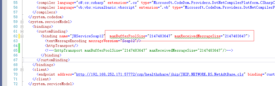 如果你的程序是”客户端程序(配置文件叫app.config)“,就需要在app.config配置文件里面的<binding>上配置"maxBufferPoolSize"和”maxReceivedMessageSize“这2个属性如图