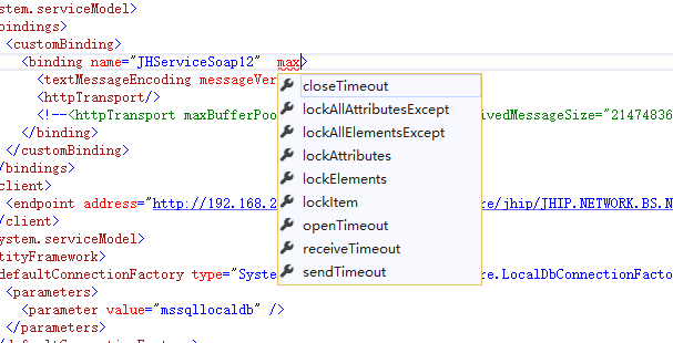 于是我注意到<httpTransport>这个节点,里面一个属性都没写,这很可疑。于是我尝试着在这个节点输入了max,然后出现了"maxBufferPoolSize"和”maxReceivedMessageSize“这两个适配,这个时候我有种预感"哟西!"于是我将这两个节点配置上了图中的绿字注释那样的属性,然后运行,结果齐活。