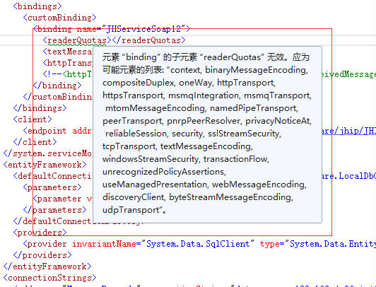 不过微软的东西出毛病很正常嘛。不管他直接点击运行。结果问题依旧。于是我怀疑可能是版本不一样吧。<binding>的属性已经发生了变化。程序也分为部署在服务器上的和部署在客户端上面的。我仔细看看我前文中提到的第一篇文章,里面也的确说了服务器和客户端的配置是不一样的。我有按照这篇文章的服务器的解决办法做,大概是在<binding>添加一个叫<readerQuotas>的节点,<readerQuotas>有自己相关的配置属性。于是我照着他的改。结果是这样: