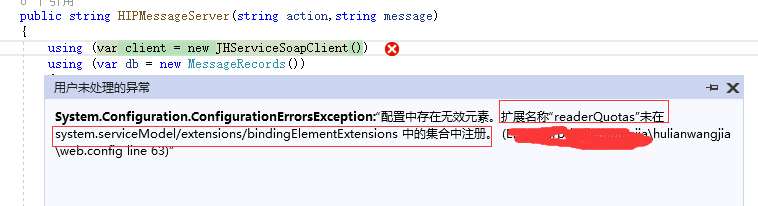 最近做项目的时候遇见了这样一个问题,在用代理类请求webservice的时候会爆出一个这样的错误”已超过传入消息(65536)的最大消息大小配额“。向下面图中这样。