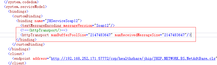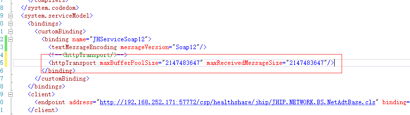 如果你的程序是一个”服务(运行在服务器上的)如WebService和WCF(配置文件明知叫:web.config)”,就需要在web.cinfig配置文件的<binding>里面的<httpTransport>节点里面配置"maxBufferPoolSize"和”maxReceivedMessageSize“这2个属性,如图: