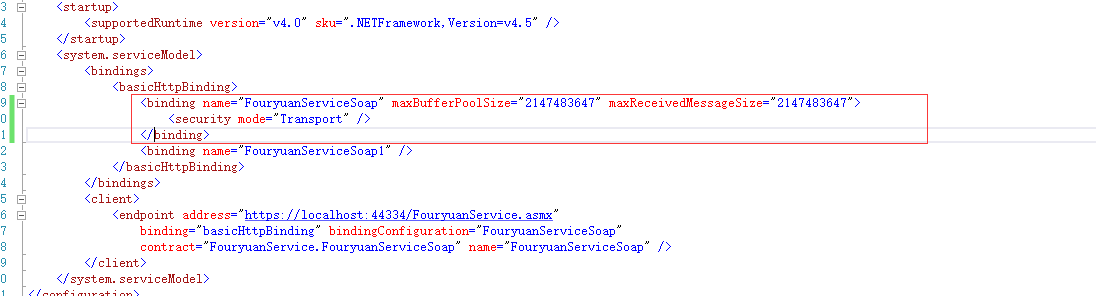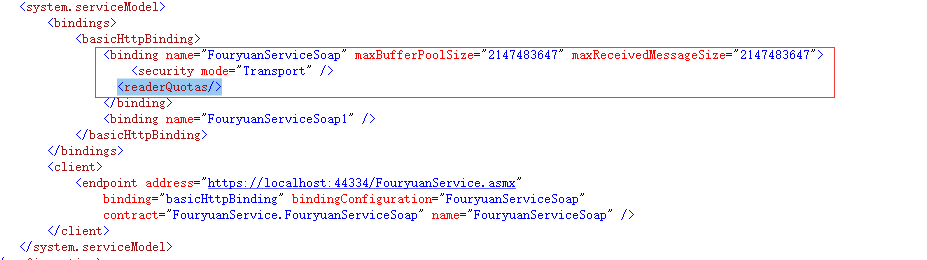 <binding name="FouryuanServiceSoap" maxBufferPoolSize="2147483647" maxReceivedMessageSize="2147483647">