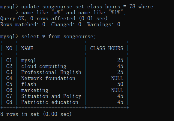 8.更新课程表中带课程名称以字母“M”开头并且课程名称中有“L”字母的记录,将课时数改为78