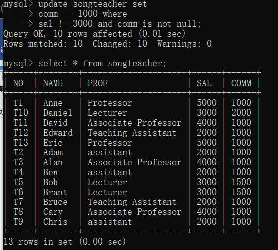 5.更新教师表中工资不等于3000并且津贴不为空的记录,将津贴改为1000