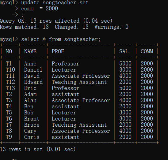 1.更新教师表中所有记录,将津贴改为2000