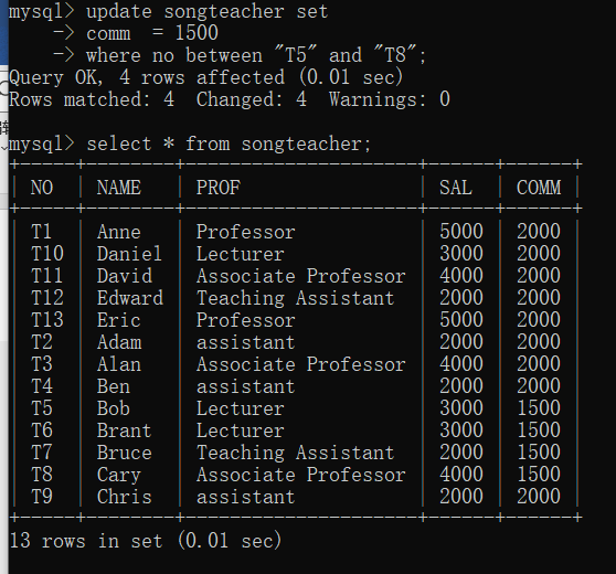 2.更新教师表中教师号在T5到T8之间的记录,将津贴改为1500