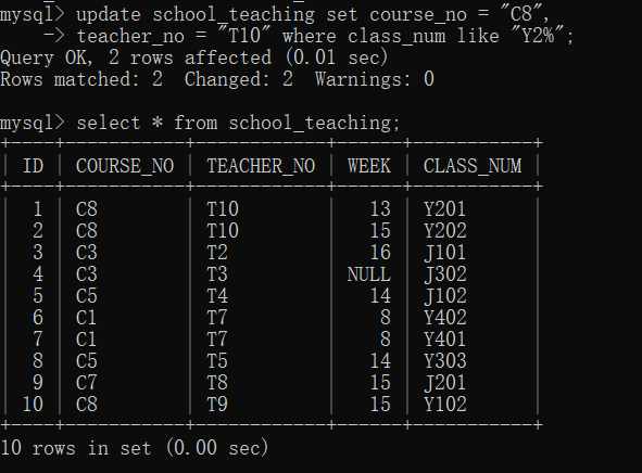 9.更新授课表中教室在Y栋2楼的记录,将课程号改为C8,教师号改为T10