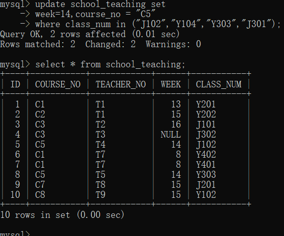 6.更新授课表中教室号在J102,Y104,Y303,J301中的记录,将周数改为14,课程号改为C5