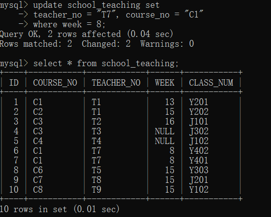 3.更新授课表中周数为8的记录,将教师号改为T7,课程号改为C1