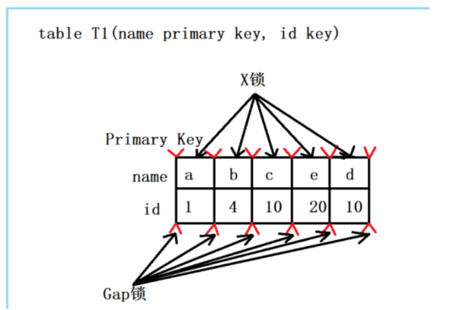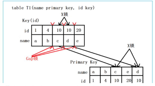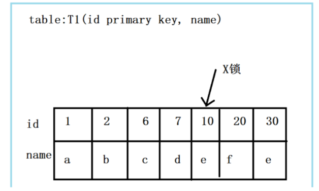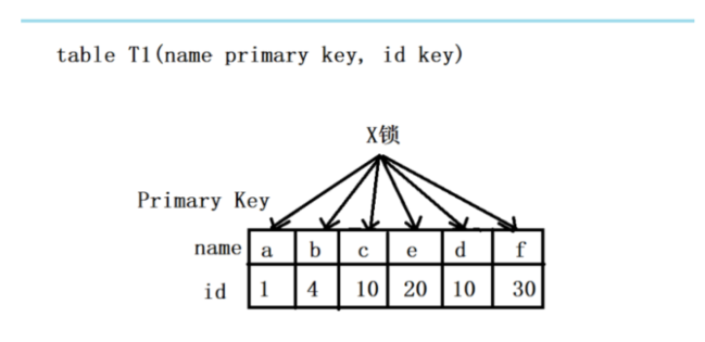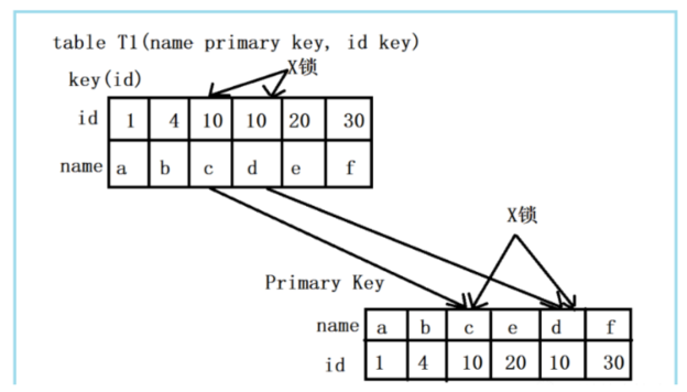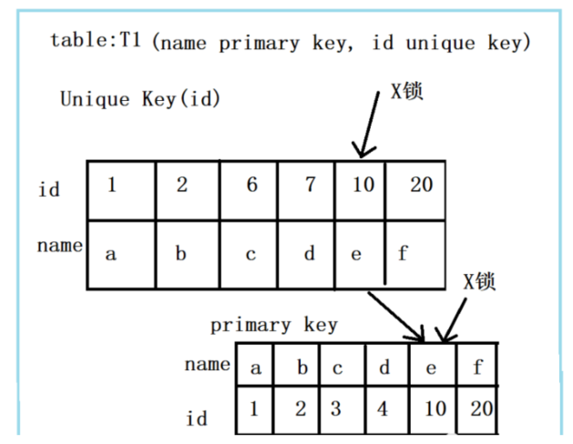 此组合中,id是unique索引,而主键是name列。此时,加锁的情况由于组合一有所不同。由于id是unique索引,因此delete语句会选择走id列的索引进行where条件的过滤,在找到id=10的记录后,首先会将unique索引上的id=10索引记录加上X锁,同时,会根据读取到的name列,回主键索引(聚簇索引),然后将聚簇索引上的name = ‘d’ 对应的主键索引项加X锁。