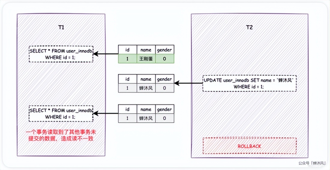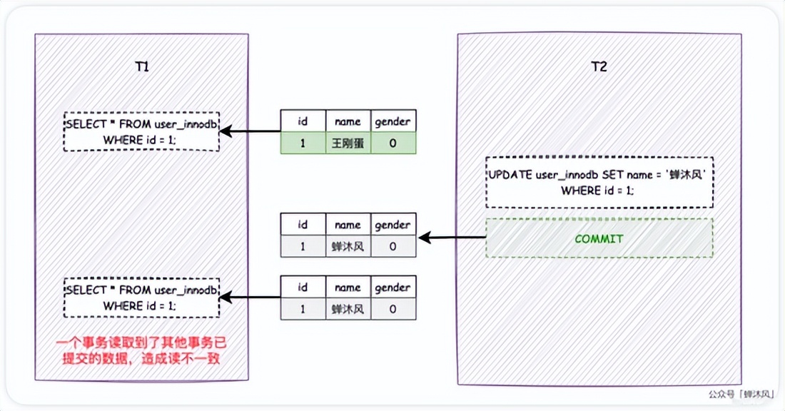 此时, T1 再次执行相同的查询操作,会发现数据发生了变化, name 字段由「王刚蛋」变成了「蝉沐风」。