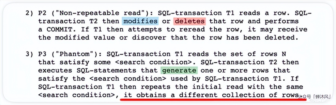 SQL标准对于不可重复读已经说得很清楚了,事务 T2 要对 T1 读取的记录进行修改或者删除操作,并且必须要提交事务。但是对于幻读的定义就说得很模糊,尤其是文中使用了 generate(生成/产生) ,再结合 one or more rows ,我们可以认为事务 T2 执行了 INSERT 语句插入了之前没有读到的记录,或者是执行了更新记录键值的 UPDATE 语句生成了符合 T1 之前的搜索条件的记录,总之只要是事务 T1 之前没有读到的数据,都算是幻影数据,至于事务 T2 需不需要提交压根儿没提。