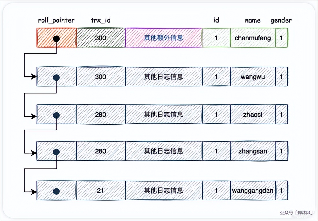 当对同一条记录更新的次数多了,所有的这些日志会被 roll_pointer 属性连接成一个单链表,这个链表就是版本链,而版本链的头节点就是当前记录的最新值。