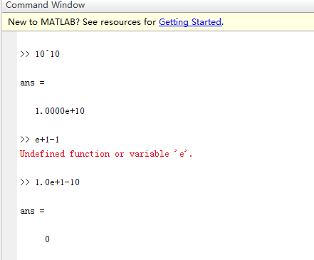 matlab中的e则有不同的意思,如果e的前面没有系数,那么命令行中的e则是未定义的不明字符。下面的例子也足够说明。如果前面有系数,且后面有正负号以及数值,则是以10位底数的对数。