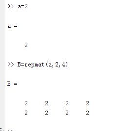repmat(A, m, n)%当A是一个数a时,该命令产生一个全由a组成的m*n矩阵