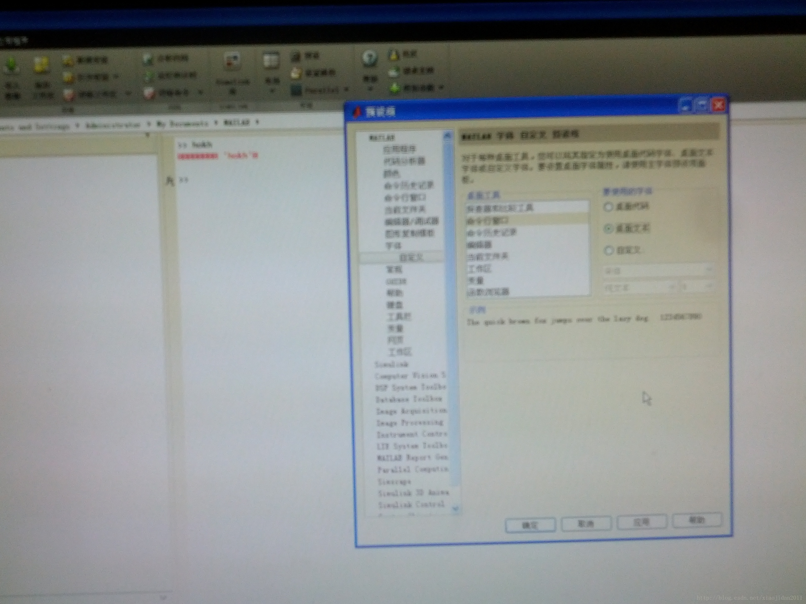 2 这种方法,我觉得更容易理解, 因为我们出现乱码是在command window中,类似在文本txt中显示了乱码, 大家可以这样设置,在“字体”选项的下面有“自定义”选项,然后再桌面工具的子栏中选择“命令行窗口”,在右边的选项中,选择第二选项“desktop text”,即桌面文本,即可。图片有点模糊的, 大家勉强看吧, 嘿嘿,