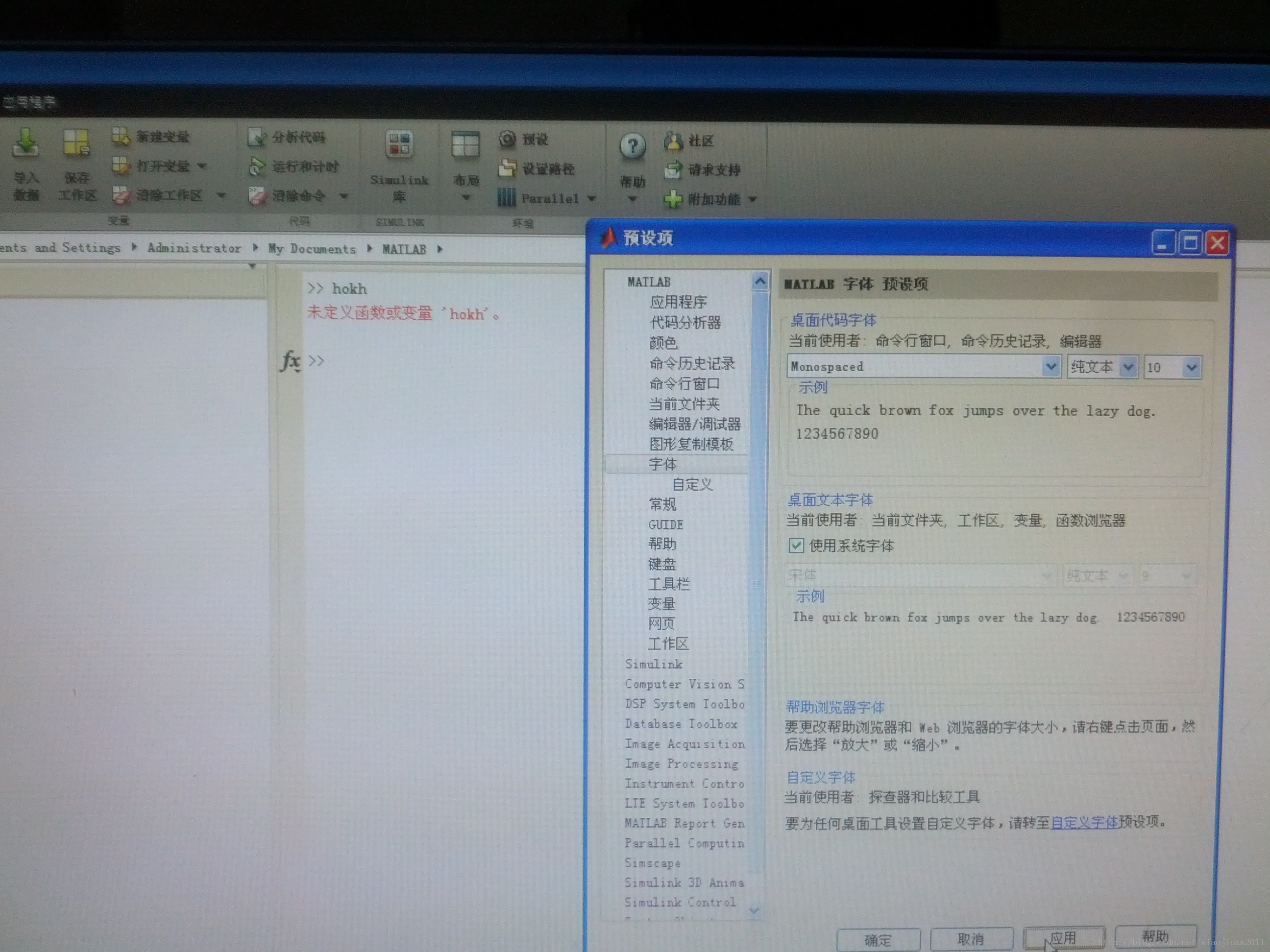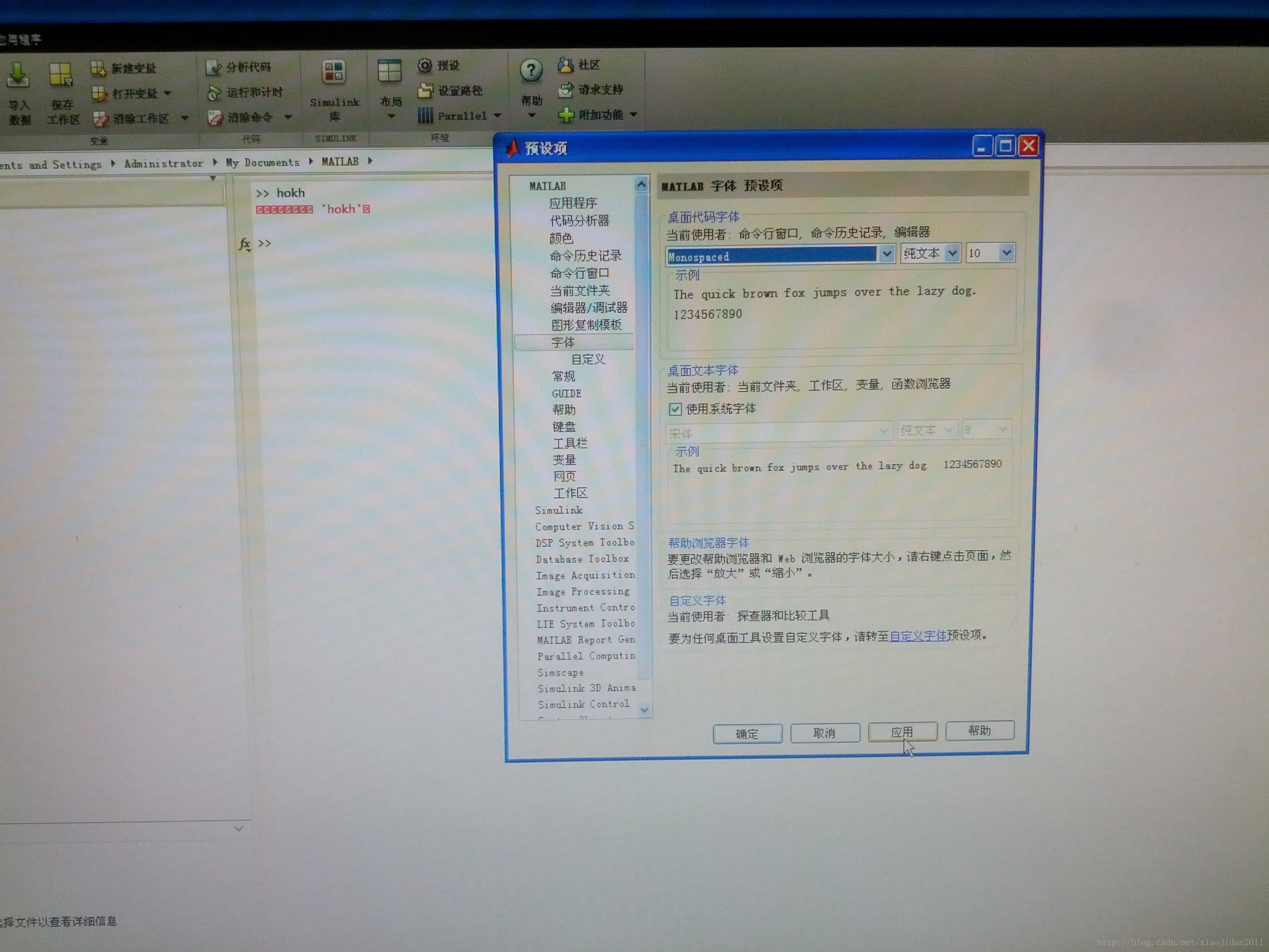 我现在command window 随便输入一些字母, 比如“hokh”, 看出现乱码了吧, 好的别急。 在主界面中找到 “预设”选项, 点击进去,然后选择字体选项,由于之前matlab2014a默认的字体的缘故, 无法映射到本地的系统, 可以选择别的字体, 比如我选择了“Monospaced”, 然后点击应用, 就可以啦