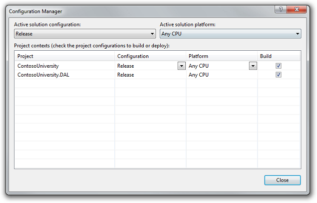 生产环境使用默认的Release build配置,测试环境如果你能用debug的话也可以使用默认的Debug build配置。如果需要在测试环境部署Release版本的程序的话,你可以创建一个Test build配置。