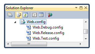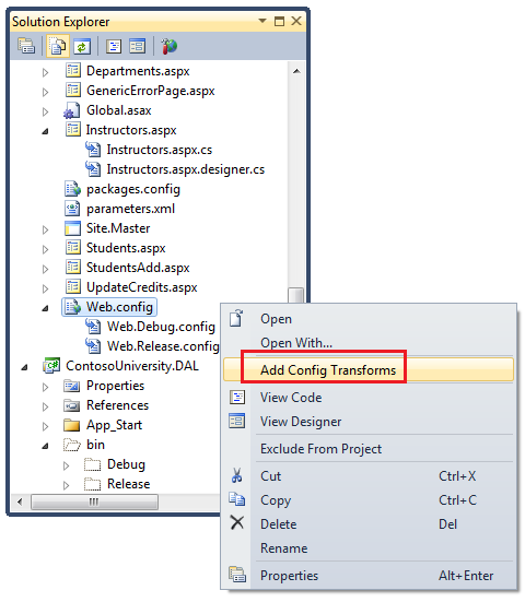 还需要一个Web.config transform文件来对应Test build配置。在Solution Explorer里,展开Web.config 文件可以看到默认创建的Web.Debug.config和Web.Release.config文件,右键Web.config 然后选择Add Config Transforms。