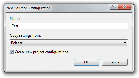 在Active solution configuration框里,选择新建New。弹出New Solution Configuration对话框,输入"Test"作为新build配置的名称,然后选择从Release复制设置。保存Create new project configurations选中,然后点击OK。