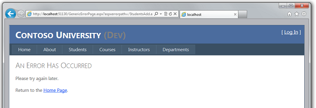 要看该错误页面,可以临时设置customErrors元素的mode值为"On"然后从Visual Studio里运行程序。输入非法的URL地址(例如Studentsxxx.aspx),你可以看到替代"page not found" 错误页面的自定义错误页GenericErrorPage.aspx页面。