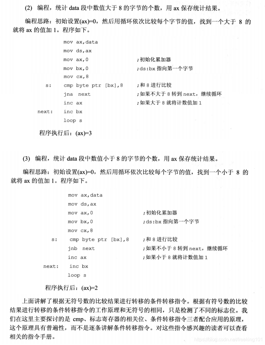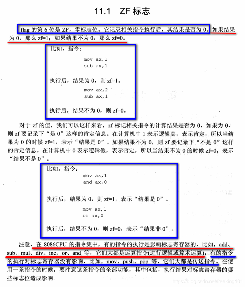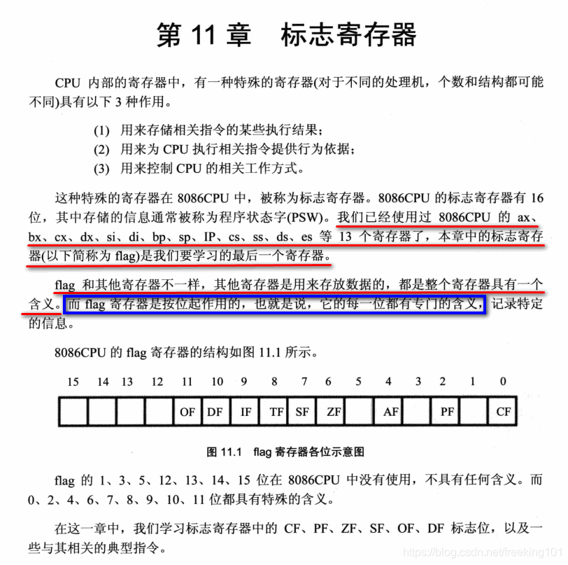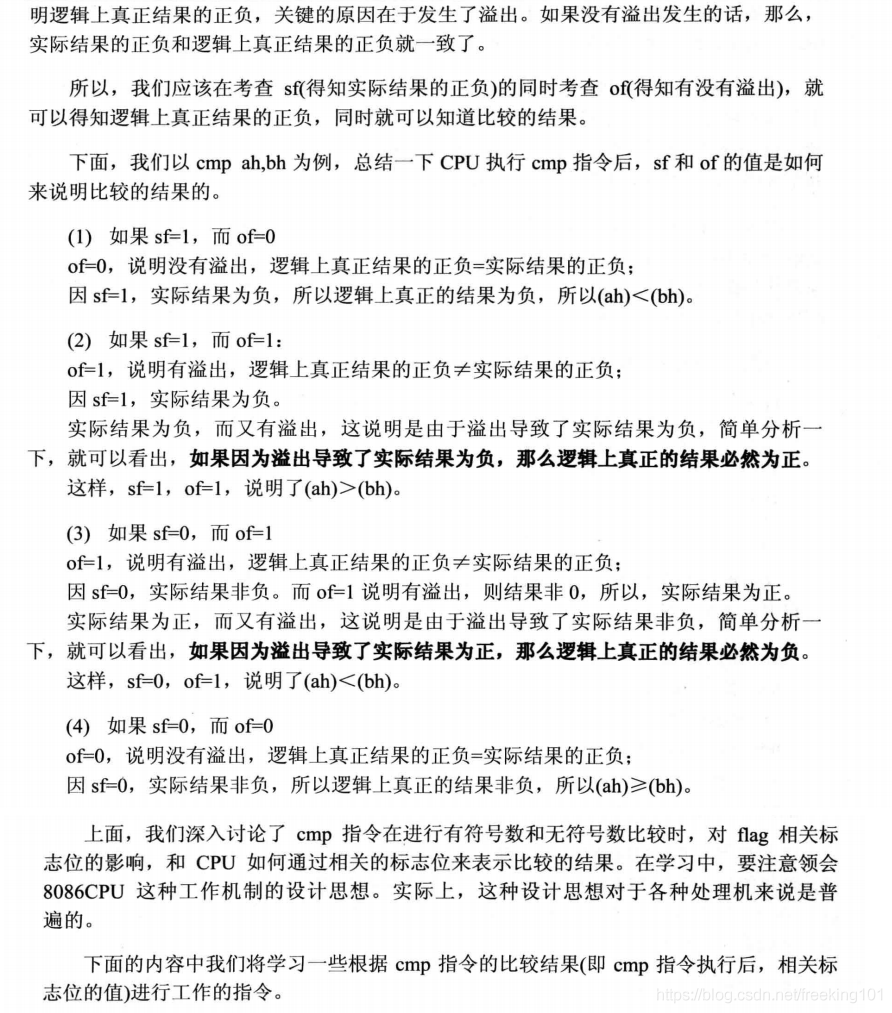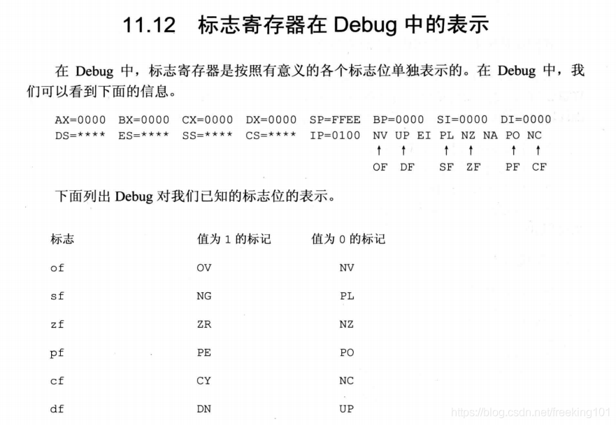 以上就是文艺芒果最近收集整理的关于王爽 汇编语言第三版 第11章 标志寄存器11.1 ZF 标志( 0 标志位 )11.2 PF 标志( 奇偶 标志位 )11.3 SF 标志 ( 结果正负标志。0 表示 正,1 表示 负 )11.4 CF 标志 ( 进位 标志位 )11.5 OF 标志 ( 溢出 标志位 )11. 6 adc 指令11.7 sbb 指令11.8 cmp 指令11.9 检测比较结果的条件转移指令11.10 DF 标志 和 串传送指令11.11 pushf 和 popf11.12 标志寄存器在 debug 中的表示实的全部内容,更多相关王爽内容请搜索靠谱客的其他文章。