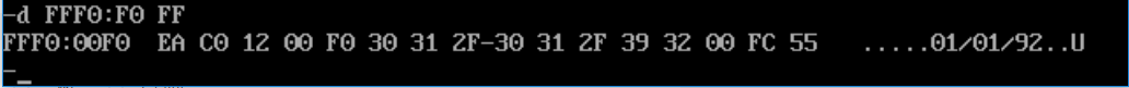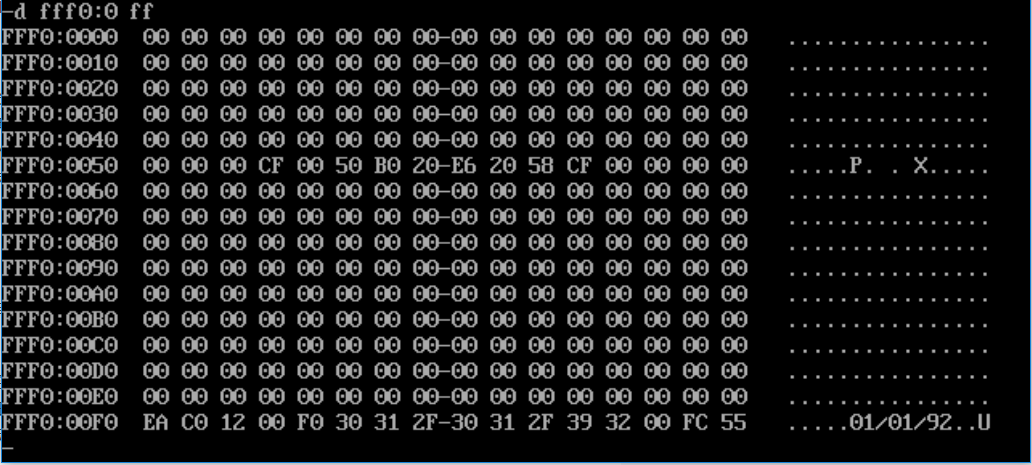 显示出范围 FFF00H~FFFFFH 的全部内容,在最右边的ASCALL码输出显示区,我们看到了生产日期:01/01/92。对应中间的字节,则日期范围是 FFFF5H~FFFFCH 。那么接下来修改日期的话,我们就需要修改 FFFF5H~FFFFCH 内存范围的内容即可。