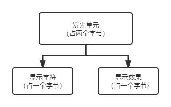 每个发光单元实际上对应我们显存地址空间里面的两个连续内存单元内容,为什么是两个连续内存单元?因为一个内存单元存放需要显示的字符,另外一个存放的内容则是显示效果。显示效果就是字符颜色、背景色、高亮闪烁这些显示效果。
