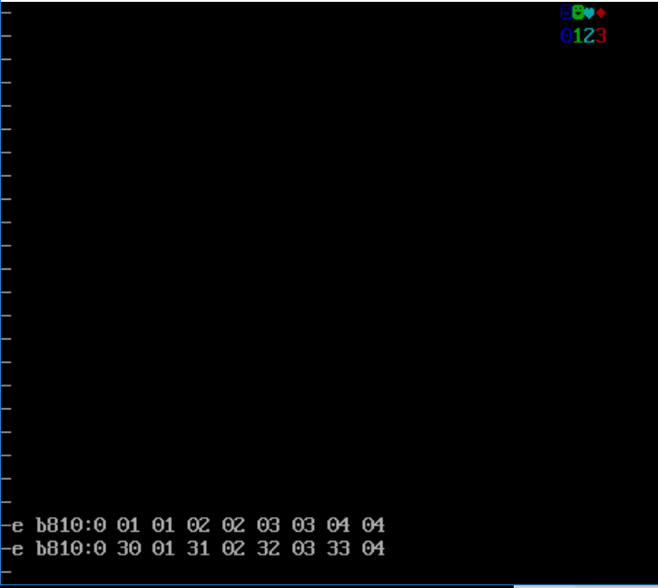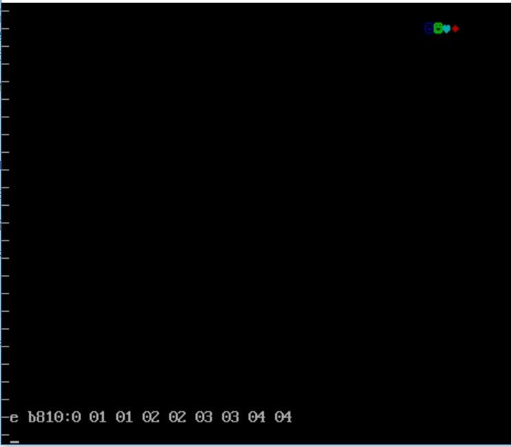- 由于修改的是显存地址空间,所以屏幕显示出本次E命令修改的字符。