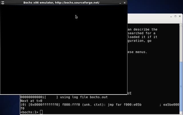 大家看到,这一下弹出了两个界面,前面的那个是bochs所模拟的机器,可以认为它就是台电脑了,不仅仅是电脑的显示器。后面的界面是bochs的控制台,咱们控制bochs运行就要在这里输入命令。现在击活后面的bochs控制台,输入字符c后,回车,bochs所模拟的机器就开始运行了。这里键入的c是continue,调试方法同gdb类似,详细的bochs操作方法咱们会在下一章中介绍。
