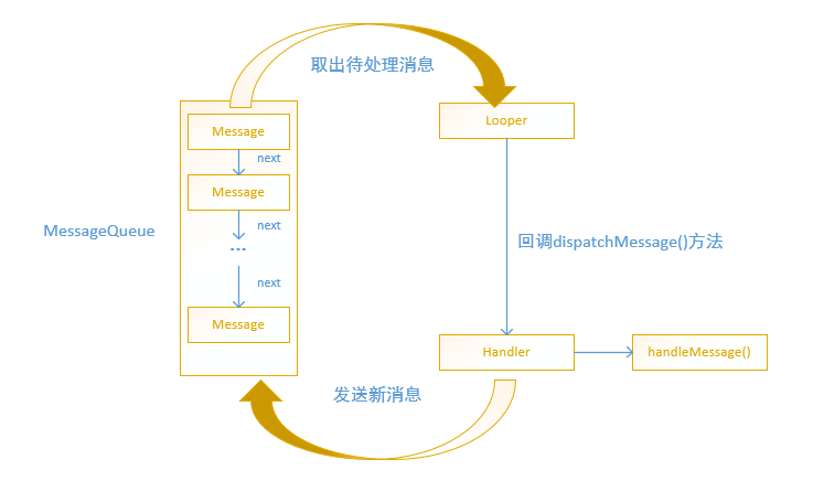 在其他线程B中通过HandlerA通过SendMessage系列方法将消息发送到线程A的消息队列中,Looper将依次取出消息队列中的各个消息,并重新交给HandlerA对消息进行处理。