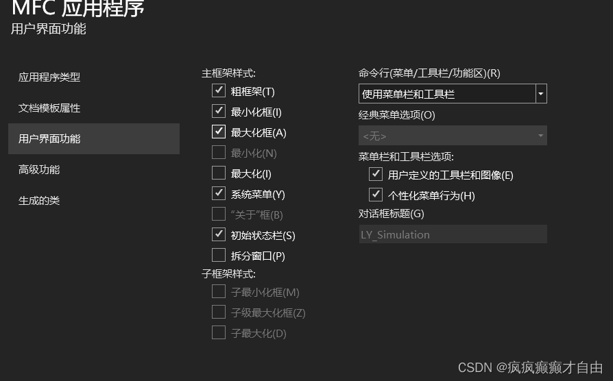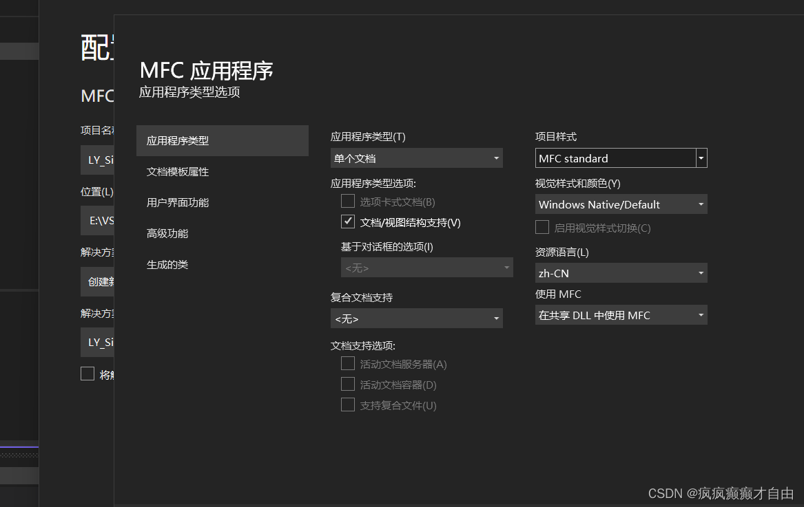 创建MFC应用,选择单文档,在应用程序类型中的应用程序类型选择单文档,在项目样式中选择MFC standard,在用户界面功能中的命令行中选择 使用菜单栏和工具栏。
