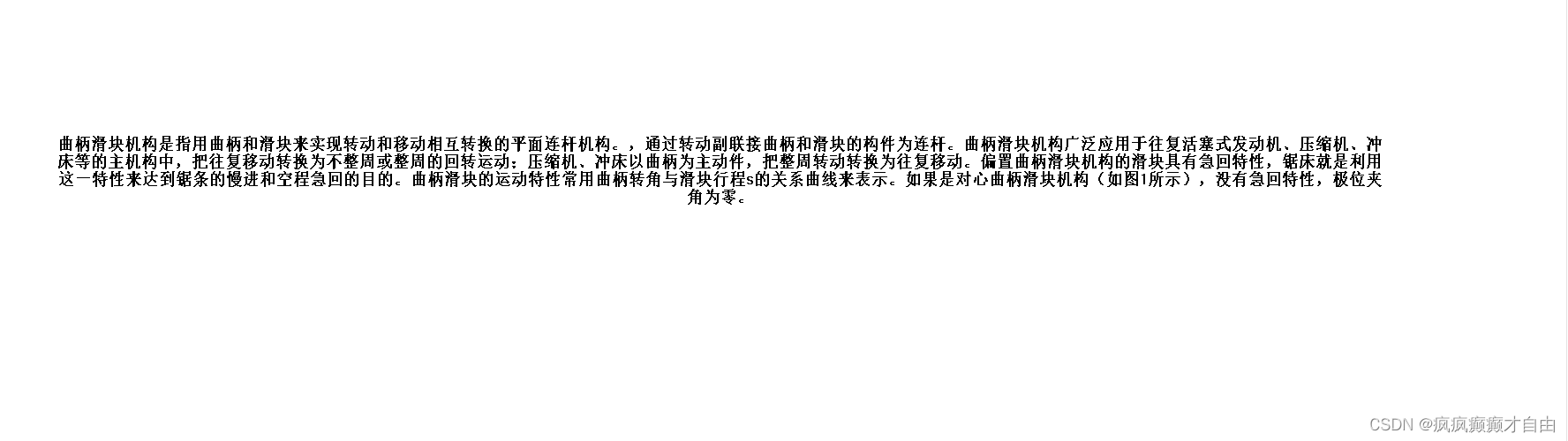 pDC->DrawText(_T("曲柄滑块机构是指用曲柄和滑块来实现转动和移动相互转换的平面连杆机构。,通过转动副联接曲柄和滑块的构件为连杆。曲柄滑块机构广泛应用于往复活塞式发动机、压缩机、冲床等的主机构中,把往复移动转换为不整周或整周的回转运动;压缩机、冲床以曲柄为主动件,把整周转动转换为往复移动。偏置曲柄滑块机构的滑块具有急回特性,锯床就是利用这一特性来达到锯条的慢进和空程急回的目的。曲柄滑块的运动特性常用曲柄转角与滑块行程s的关系曲线来表示。如果是对心曲柄滑块机构(如图1所示),没有急回特性,极位夹角为零。"), rc, DT_WORDBREAK | DT_VCENTER | DT_CENTER);