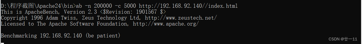 1. 打开Apache ab压力测试工具,输入如下命令:ab -n 200000 -c 5000