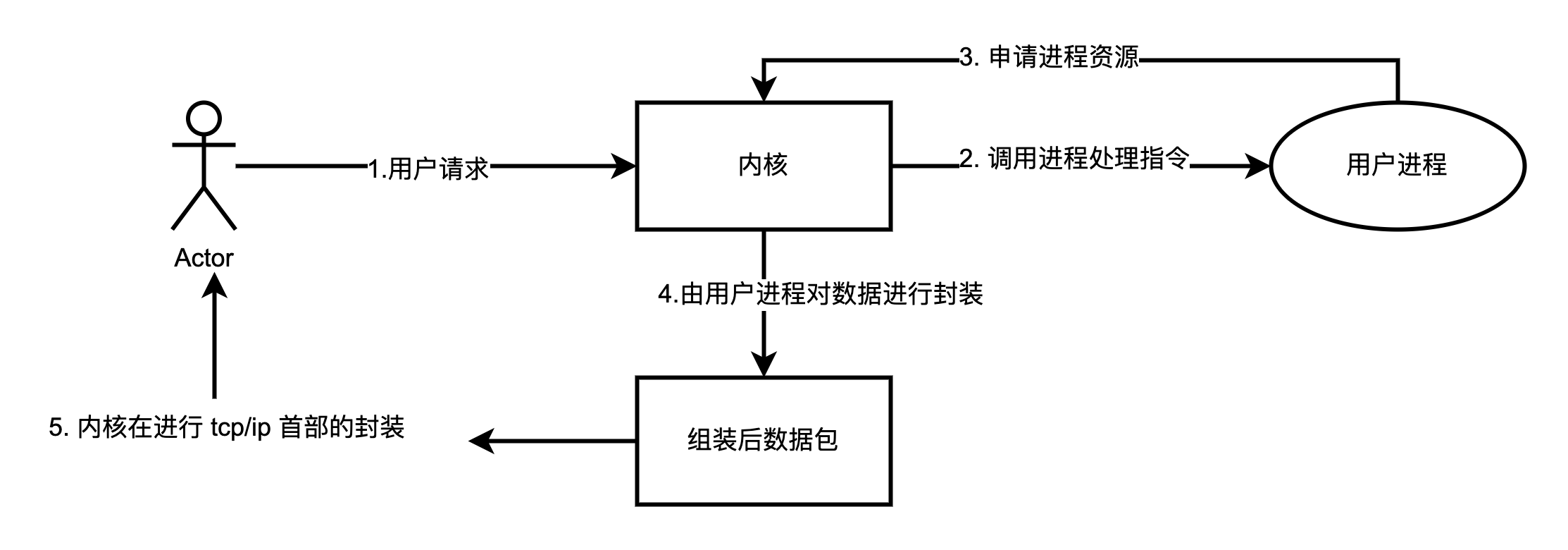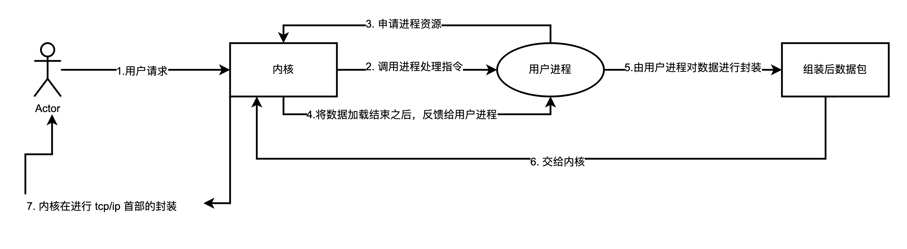 - 内核查找到数据之后,会把数据复制给用户进程,由用户进程对数据进行封装,交给内核。