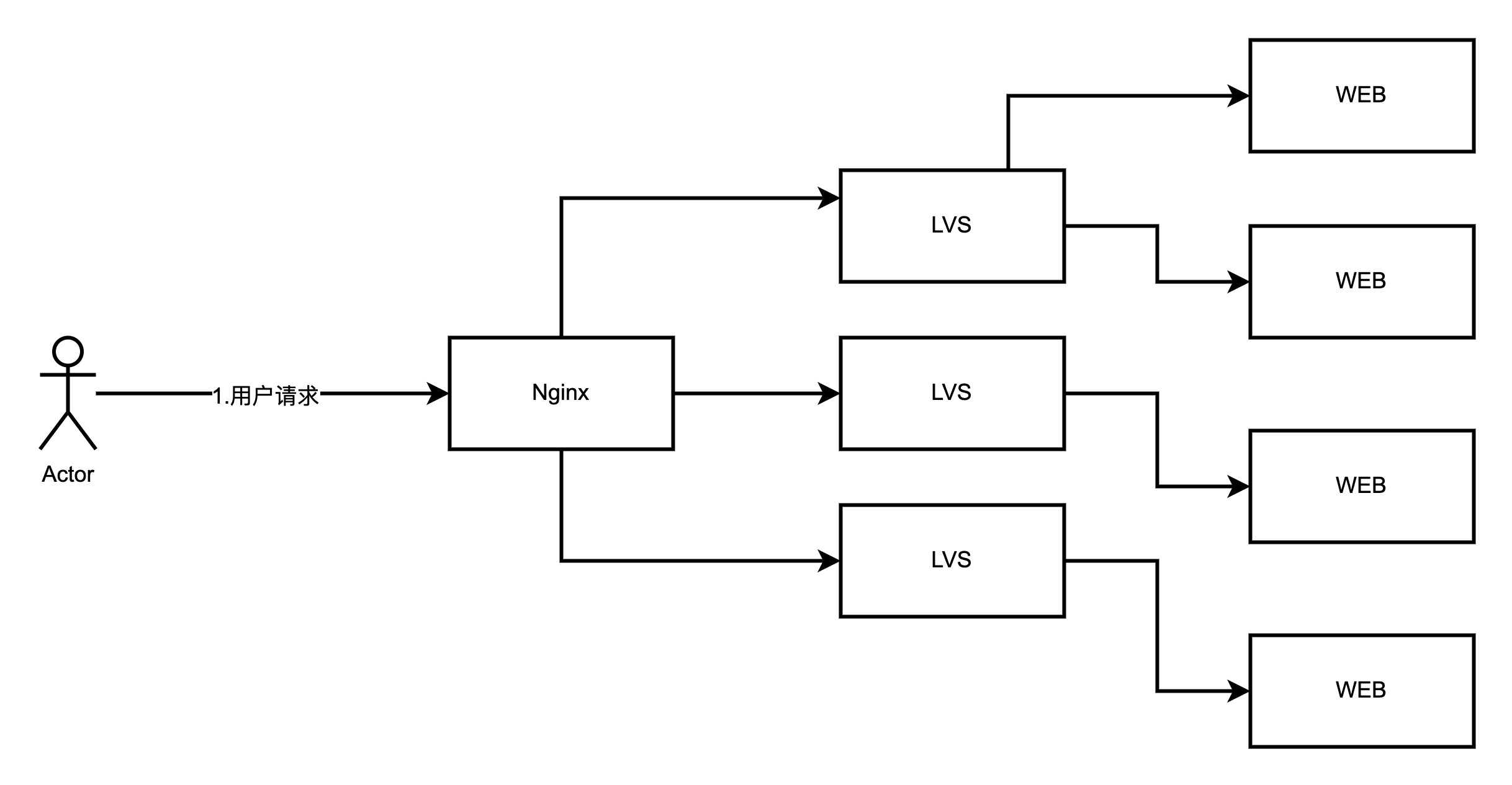LVS 作为入口负载均衡,将请求转发到二级 Ngnix 服务器,Ngnix 再根据请求转发到具体的应用服务器。