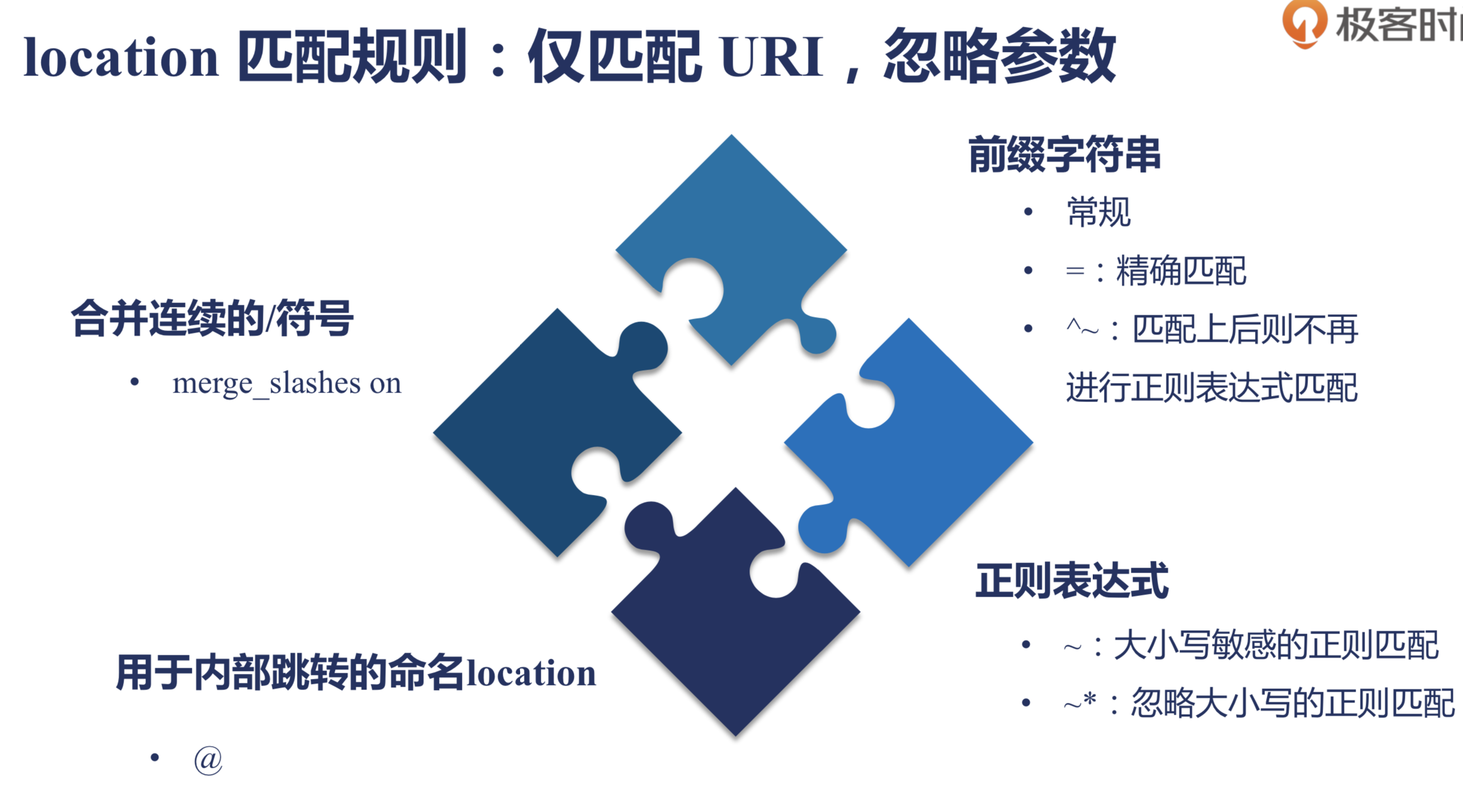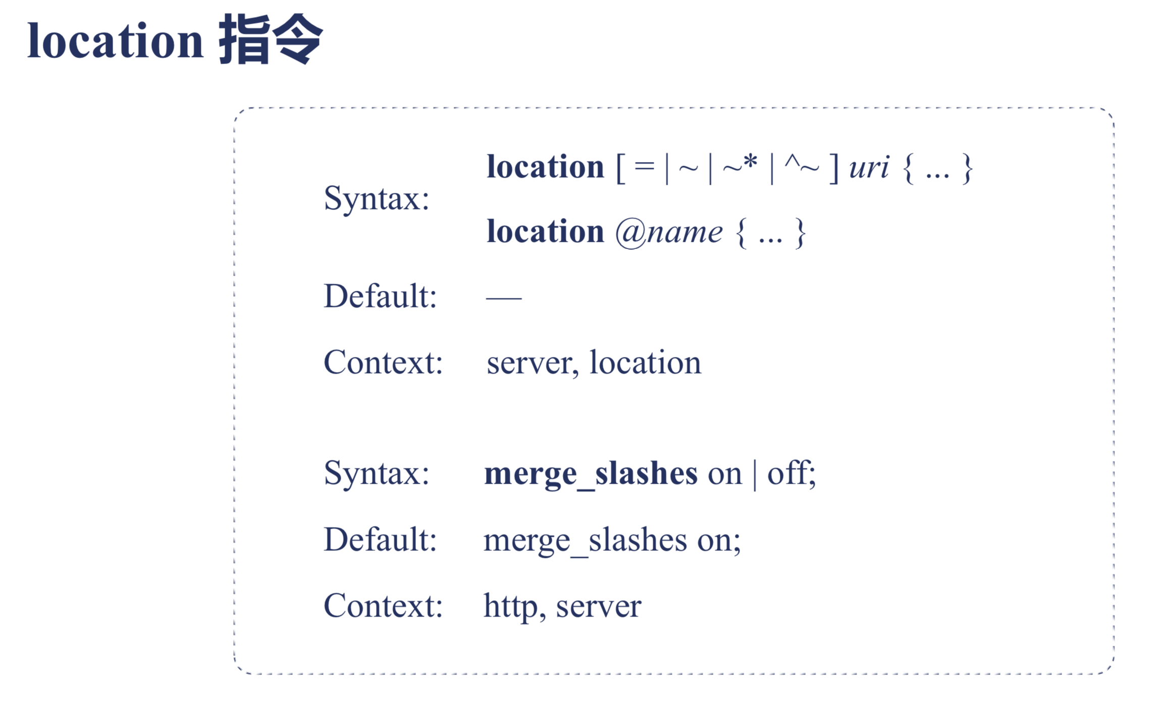 syntax : location [=|~|~*|^~] uri {...} @name {....}